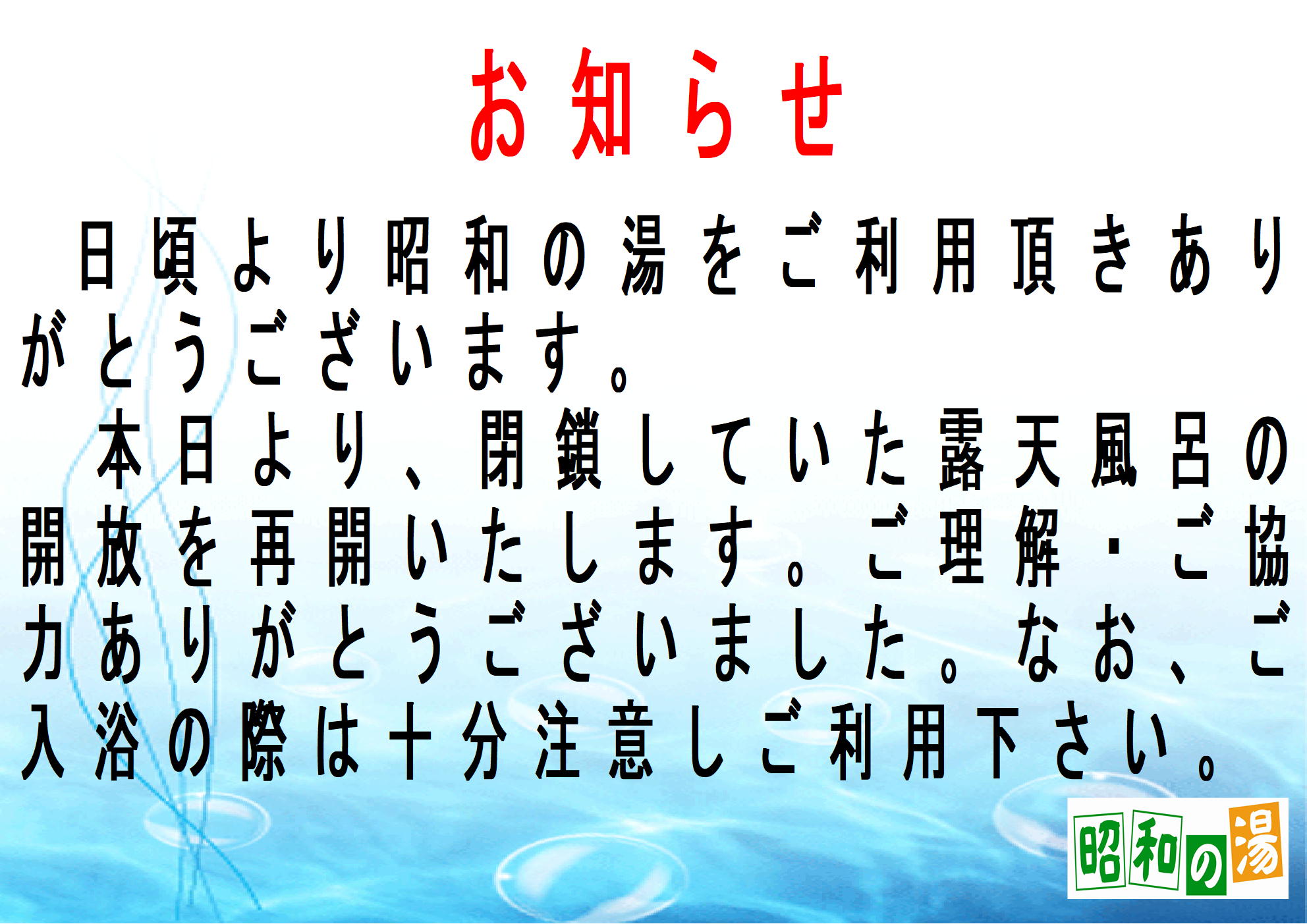 本日より、閉鎖しておりました露天風呂の開放を再開いたします。ご理解・ご協力ありがとうございました。