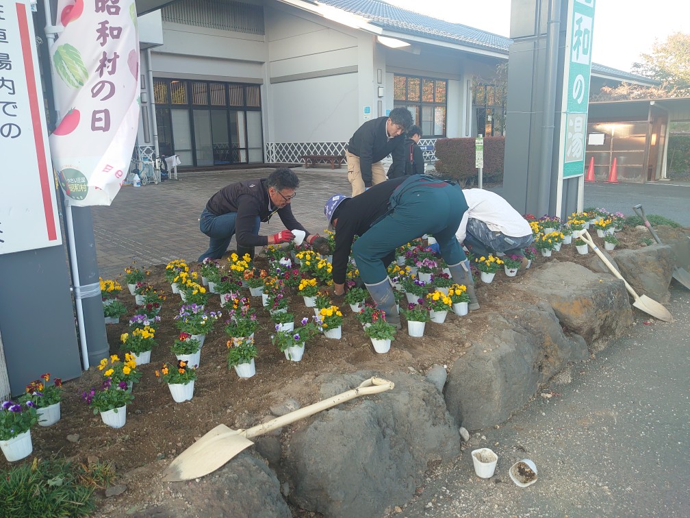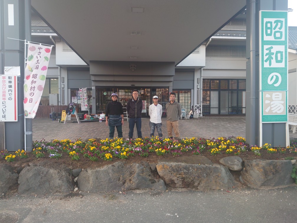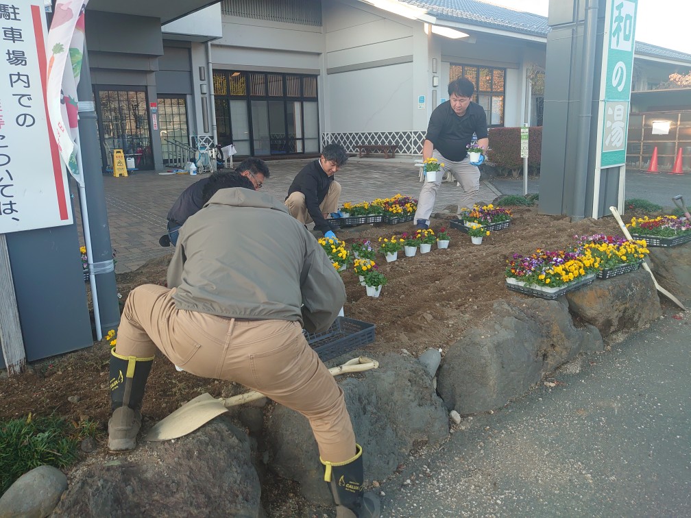 昭和の湯では、10月27日(月)に昭和村フラワーメイトの皆様のご協力により、花壇をパンジーとビオラに植えかえました。